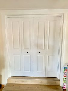We use quality fixings suited to the wall structure — not short screws into plasterboard. Instead, hinges are secured into solid timber backing or appropriate anchors. As such, the door remains stable and secure.